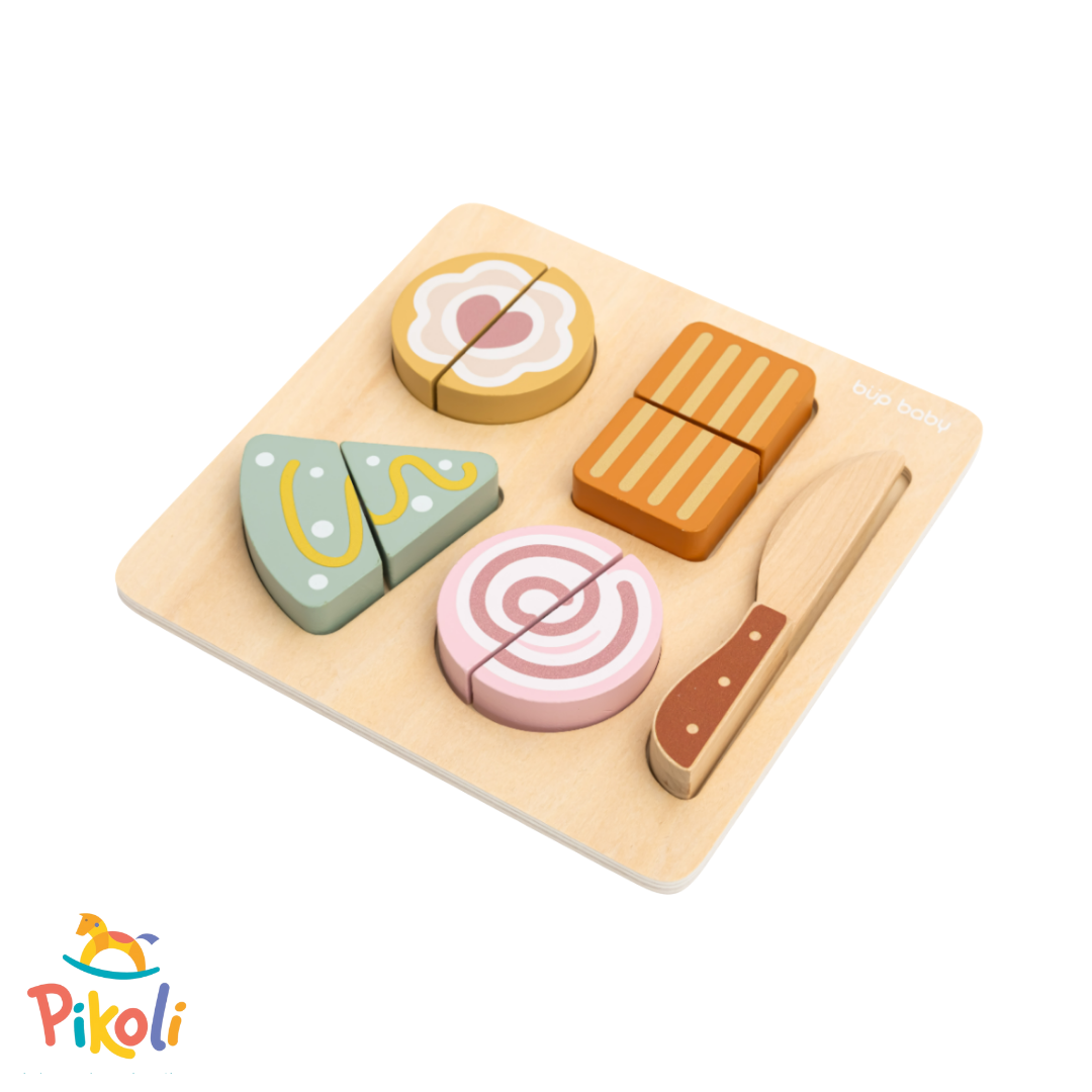Deixe a imaginação e a criatividade crescerem com o Kit Comidinha de corte feito de madeira! Com quatro sobremesas coloridas.