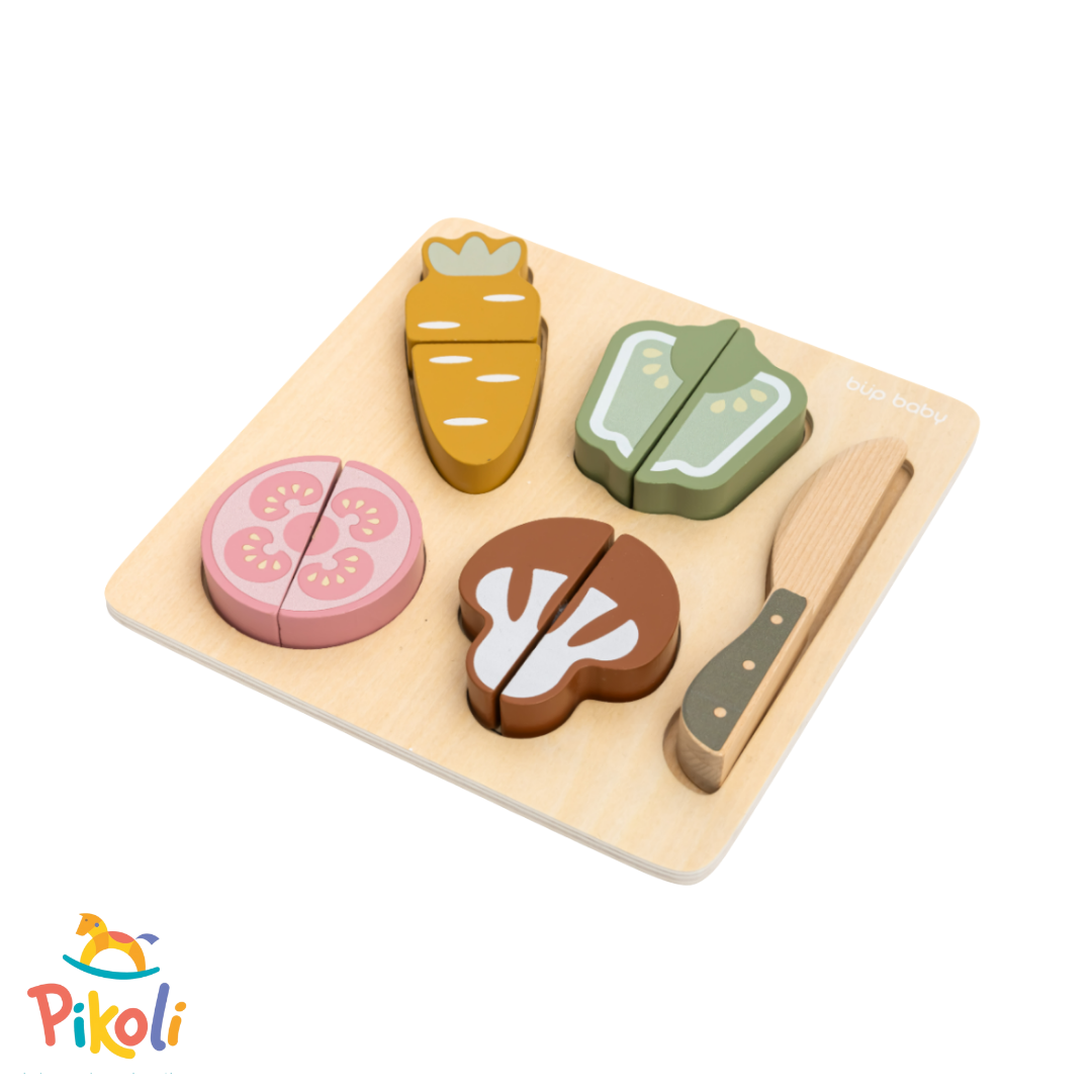 O conjunto é feito de madeira pintada e corte por velcro, sendo composto por cenoura, alface, tomate e cogumelo. Acompanhados com uma faca de madeira sem ponta.